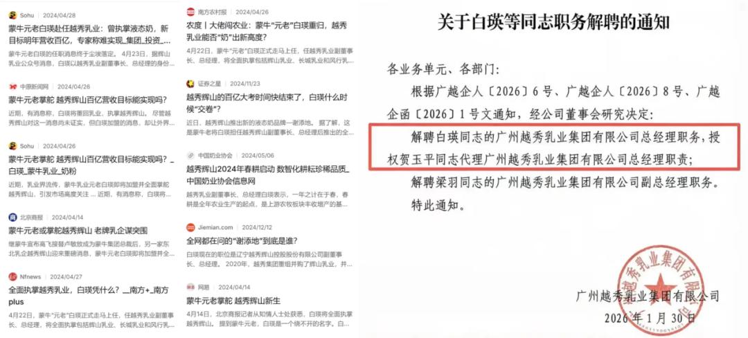 白瑛入职时,越秀乳业曾发布新闻通稿,高调宣布蒙牛创始元老加盟,媒体报道铺天盖地;离职时,却只剩一张流出的解聘通知。