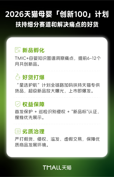 4月23日,联商网了解到,2026年天猫母婴行业将启动“创新100”计划,该计划会投入明确的资源,助力细分趋势领域以及能切实解决用户真实痛点的优质商品,帮助品牌实现新的增长。