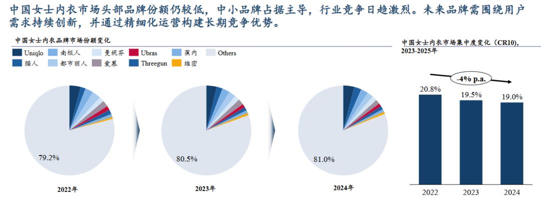 《2026全球女士内衣市场洞察白皮书》数据显示,2022年至2024年,中国女性内衣市场头部品牌CR10仅约20%。“蕉内真正的竞争对手不是优衣库这类巨头,而是市面上大量的白牌产品。”臧崇羽坦言。