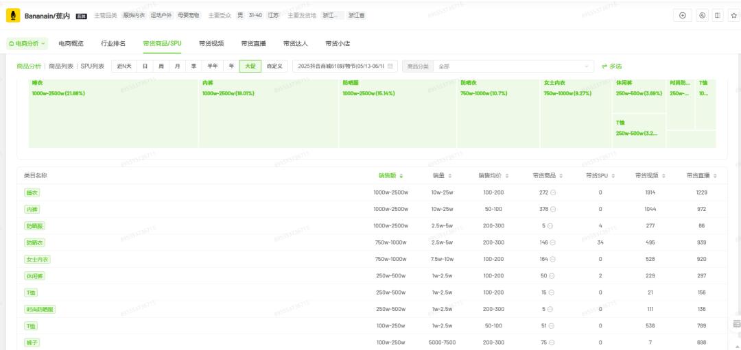 目前来看,蕉内尚未充分证明这种能力。飞瓜数据显示,2025年抖音618期间,蕉内抖音官方旗舰店销售额仍以睡衣(21.88%)、内裤(18.01%)、防晒服(15.14%)为主;短裤、背心销售额仅25万-50万元,表现偏弱。