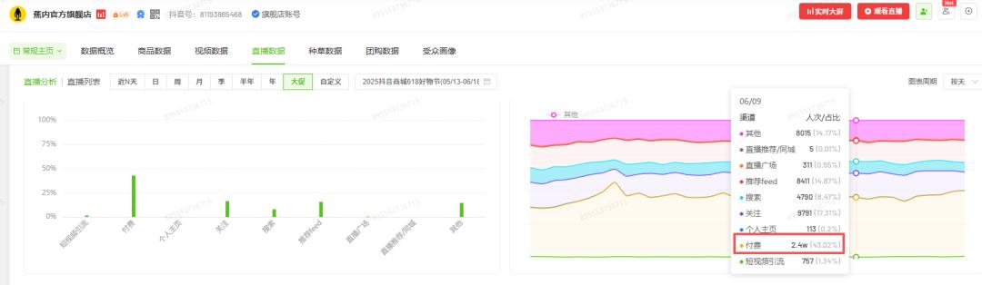 但随着电商平台红利退潮、内衣赛道竞争加剧,流量成本持续上升,渠道愈发碎片化,蕉内的“低成本高增长”时代逐渐远去。一方面,纯自然流量日益稀少,蕉内更多依赖付费投流转化。以2025年抖音618期间为例,蕉内官方旗舰店直播的流量主要来自付费投流。